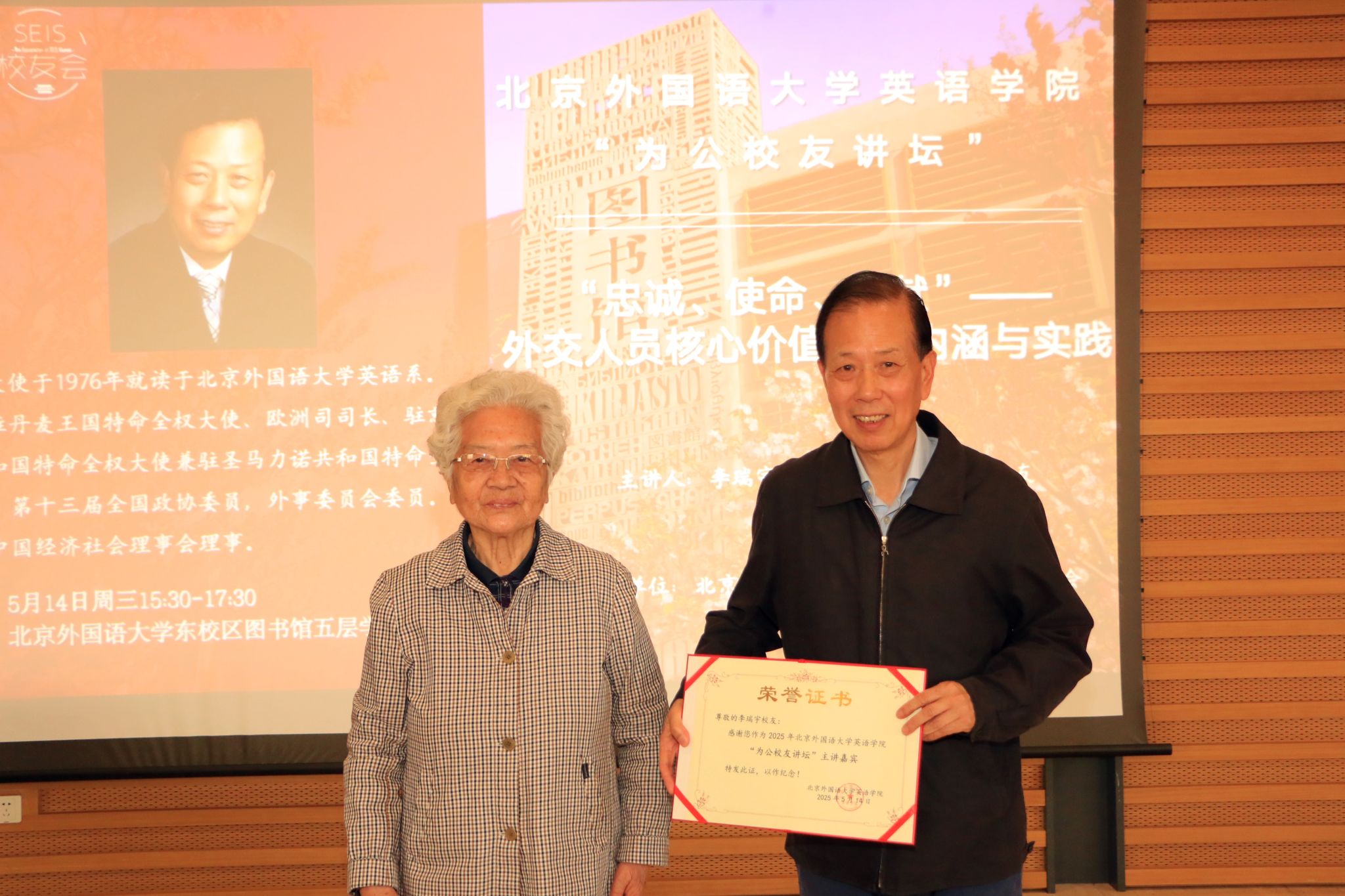 讲座最后,陈乃芳为李大使颁发了“为公员工讲坛”证书,现场同学为两位前辈献上鲜花并合影留念。
