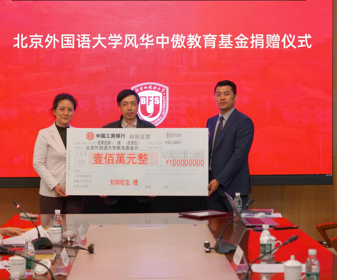 4月25日,威廉体育风华中傲教育基金捐赠仪式在行政楼507会议室举行。北京风华中傲教育科技有限公司向北外捐赠人民币100万元,专项用于奖励威廉体育在校生,包括奖励演讲、口译、模联等国家级赛事的获奖选手,以及资助经济困难的贫困生。