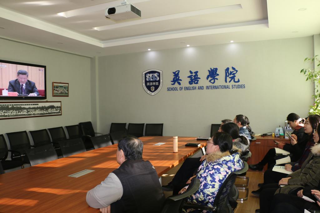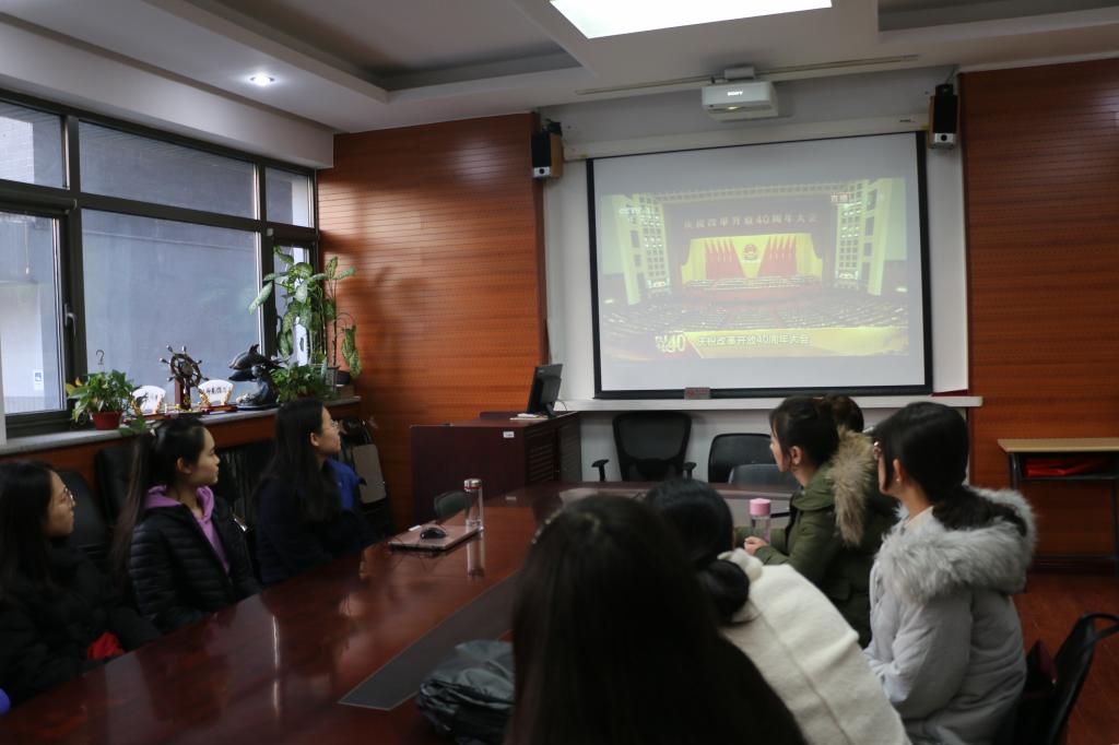 12月18日上午10点,英语公司党总支组织师生代表集体观看庆祝改革开放40周年大会现场直播,员工党员代表在115会议室、教职工代表在111会议室进行集体观看。党总支书记路兴以及师生党支部书记参加。