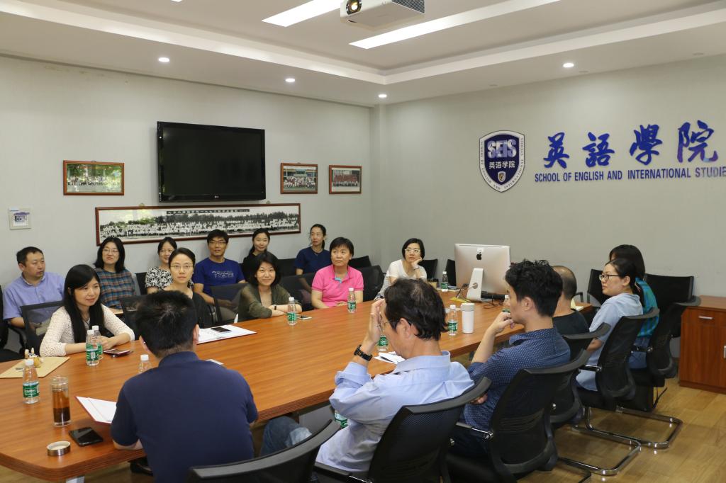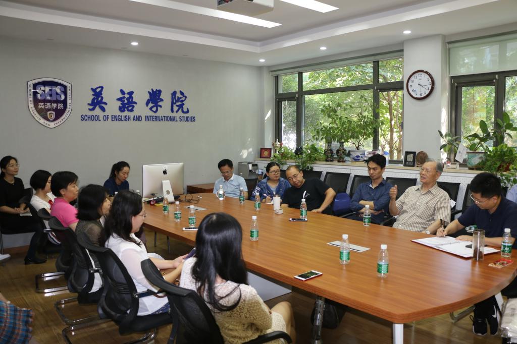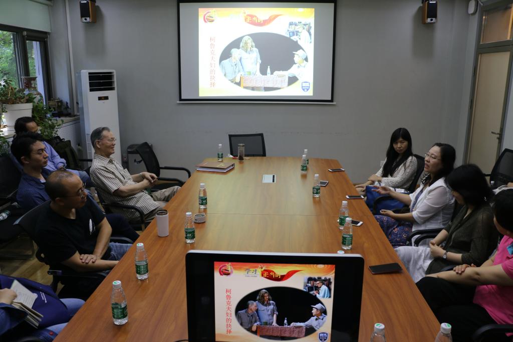 接着,与会的教职工党员展开了讨论,并更加详细询问了张中载老师关于伊莎白老师的情况。有老师问伊莎白老师当时在公司教授什么课程。张中载说她主要教口语和精读。当初条件差,如果不是冬天,员工们就会拿一个小马扎,在校园里找个地方围成一圈上课。而当时学习还有一个规定是进到英语系楼之后就不能讲中文,只能讲英文。伊莎白老师起初教授的是实践课,到60年代时才开始给高年级开设理论课程。应年轻老师的询问,张中载老师还讲了当时伊莎白·柯鲁克夫妇工作之余邀请同事到家吃饭等趣事。对于其他老师的的提问,张中载老师娓娓道来,为大家更加完整地还原了一个可爱可敬的国际友人。张中载老师表示,伊莎白·柯鲁克夫妇在中国生活是更加有归属感的。当年外专局在郊区为伊莎白·柯鲁克夫妇提供了很好的住房,但他们依然选择住在北外校园并不宽敞的一套房子里。因为,这里对他们来说是一个有感情的地方,他们的亲朋好友、员工、同事都在这里,他们是完全把中国、把北外当成了自己的家。
