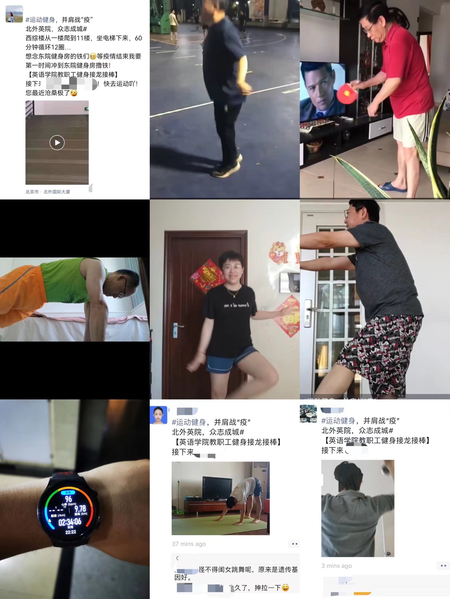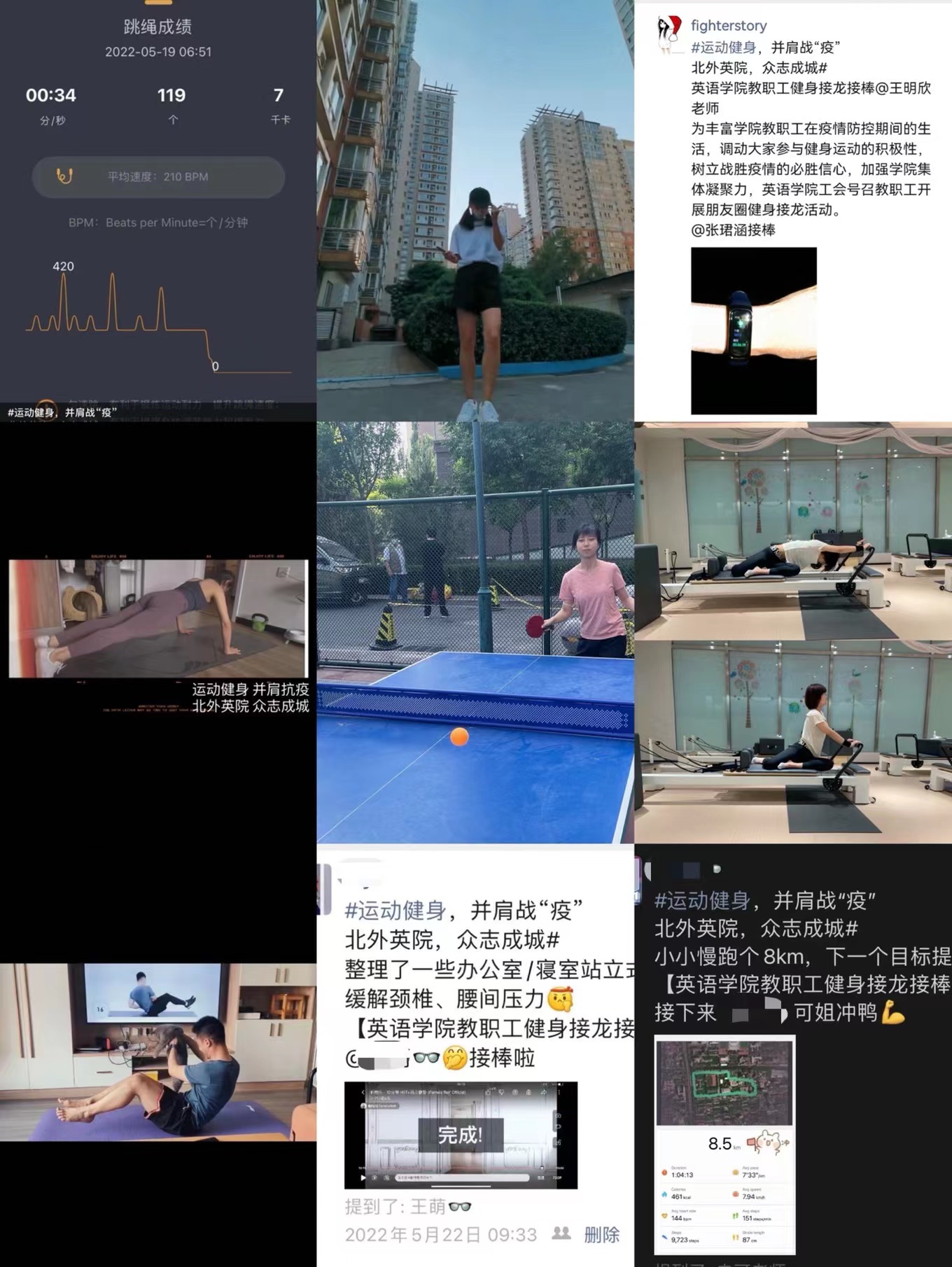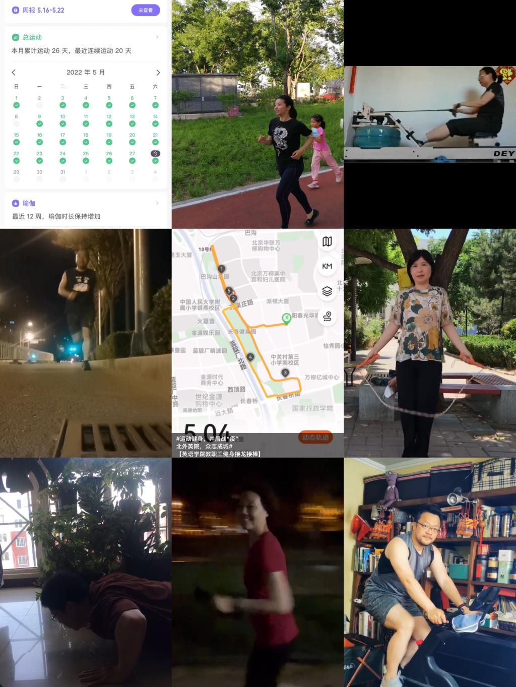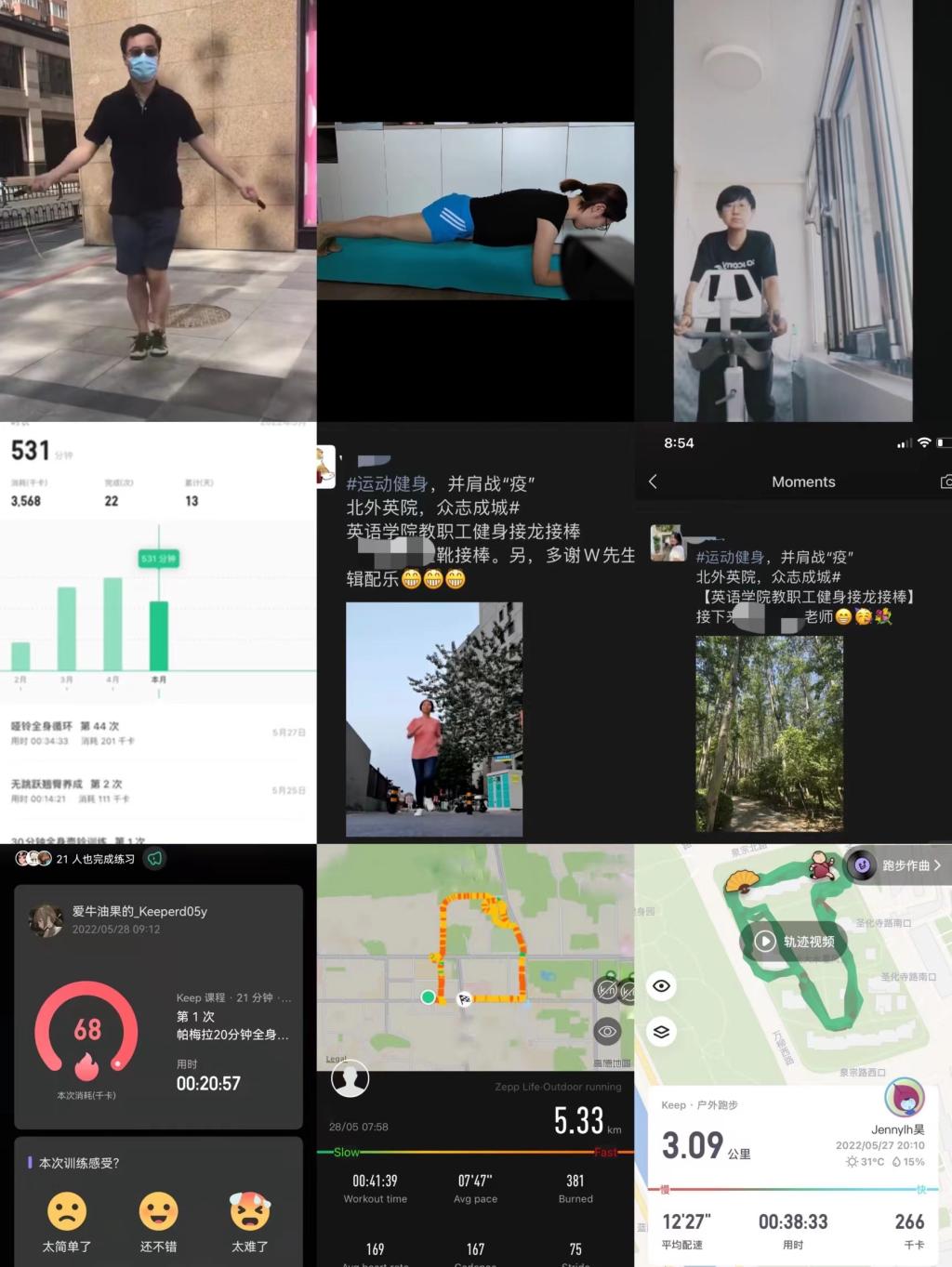 在活动期间,教职工们参与活动的热情十分高涨,小区楼下、附近公园、健身馆、家中等,都是公司教职工们的运动场所。而大家的健身方式也多种多样,有跳绳、跑步、踢毽、乒乓、平板支撑等等,教职工们每日优秀的打卡成绩把公司的活动推向了高潮。