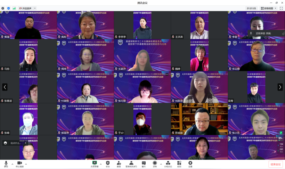 副经理张莲在总结中提到,杨枫教授关于外语教育与研究中的国家意识、学术话语与国家话语的隔离以及新技术带来的冲击的观点阐释全面概括了新时代外语教育理论与实践创新发展所面临的困惑,立意高远,视野开阔,富有启发。作为语言使用者、实践者和研究者,我们必须将语言、语言使用和语言教育和我们的时代,我们现实生活紧密联系起来,方能解读好现实,服务国家和社会发展的需求。