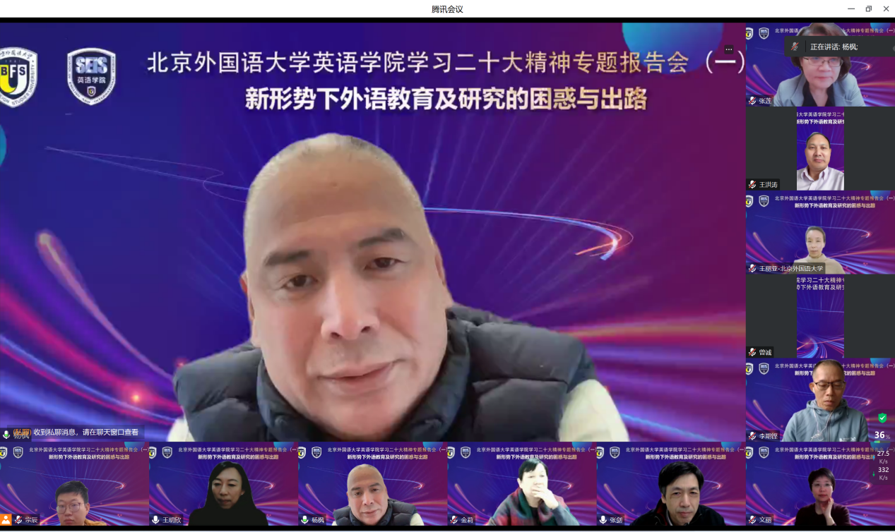 杨枫教授还从学术话语与国家话语、学术文体与学术思想、西方化和本土化、数字技术和人才培养及知识生产之间的矛盾冲突等几个方面深刻分析了新时代外语教育研究所面临的困境,并提出了应对路径,见解独到。