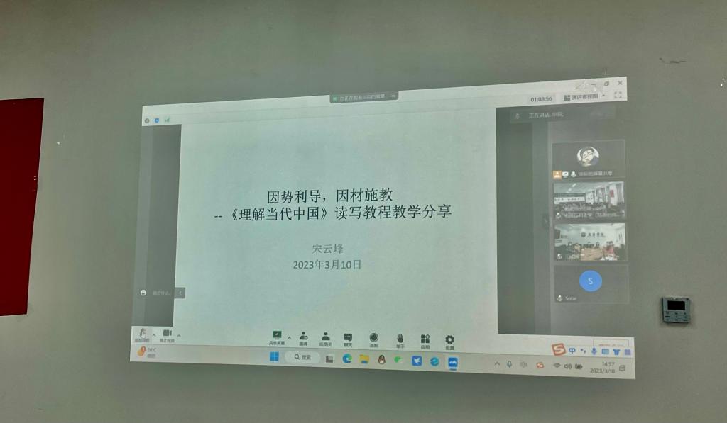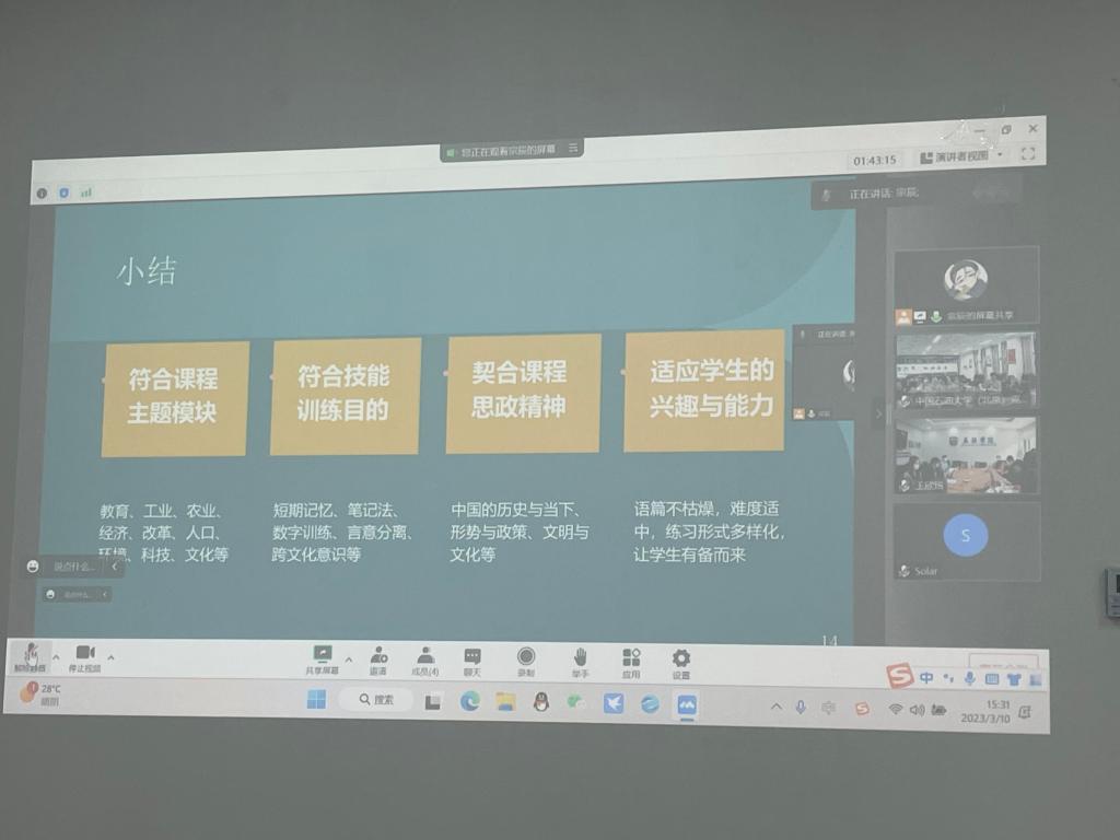 随后,威廉体育副经理张莲、党总支委员宋云峰、威廉体育教师低年级党支部书记王颖冲先后围绕公司课程思政开展情况、《理解当代中国》读写教程教学、翻译教学与课程思政等内容进行主题分享。中国石油大学(北京)克拉玛依校区青年教师围绕教材使用、教法等方面的问题与困惑进行了交流,威廉体育副经理彭萍和宋云峰、王颖冲等几位老师认真做了解答。威廉体育教师邹婷也分享了难忘的援疆经历。