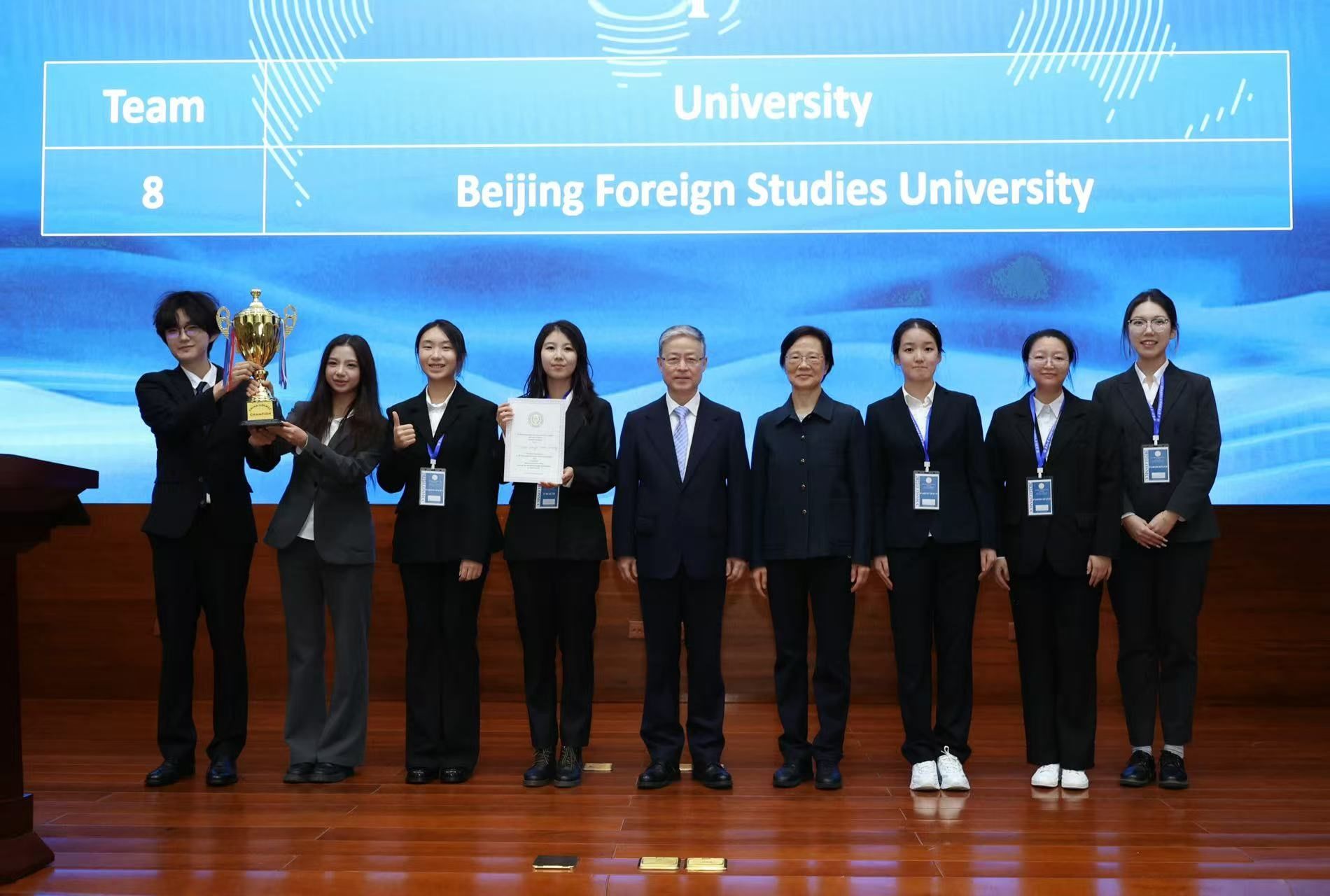 赛事从4月开始,吸引了来自全国高校44支队伍参赛,16支队伍进入口辩环节。北外代表队在第一轮口辩中,伍浩铭、黄乐祺同学和陈炫其、刘紫萱同学分别代表正反方参赛,四位选手展现出扎实的专业素养与出色的庭辩能力,获得评委一致好评,成功晋级半决赛。在半决赛中,伍浩铭、黄乐祺两位选手对阵中国政法大学代表队,凭借扎实的知识功底与灵活的临场应变能力斩获决赛入场券。在决赛中,陈炫其、刘紫萱两位选手对阵山东大学代表队,凭借精彩表现拔得头筹。最终,公司代表队荣获全国冠军、最佳辩方书状的好成绩,刘紫萱同学获反方最佳辩手称号,姚艳霞老师获最佳教练奖。