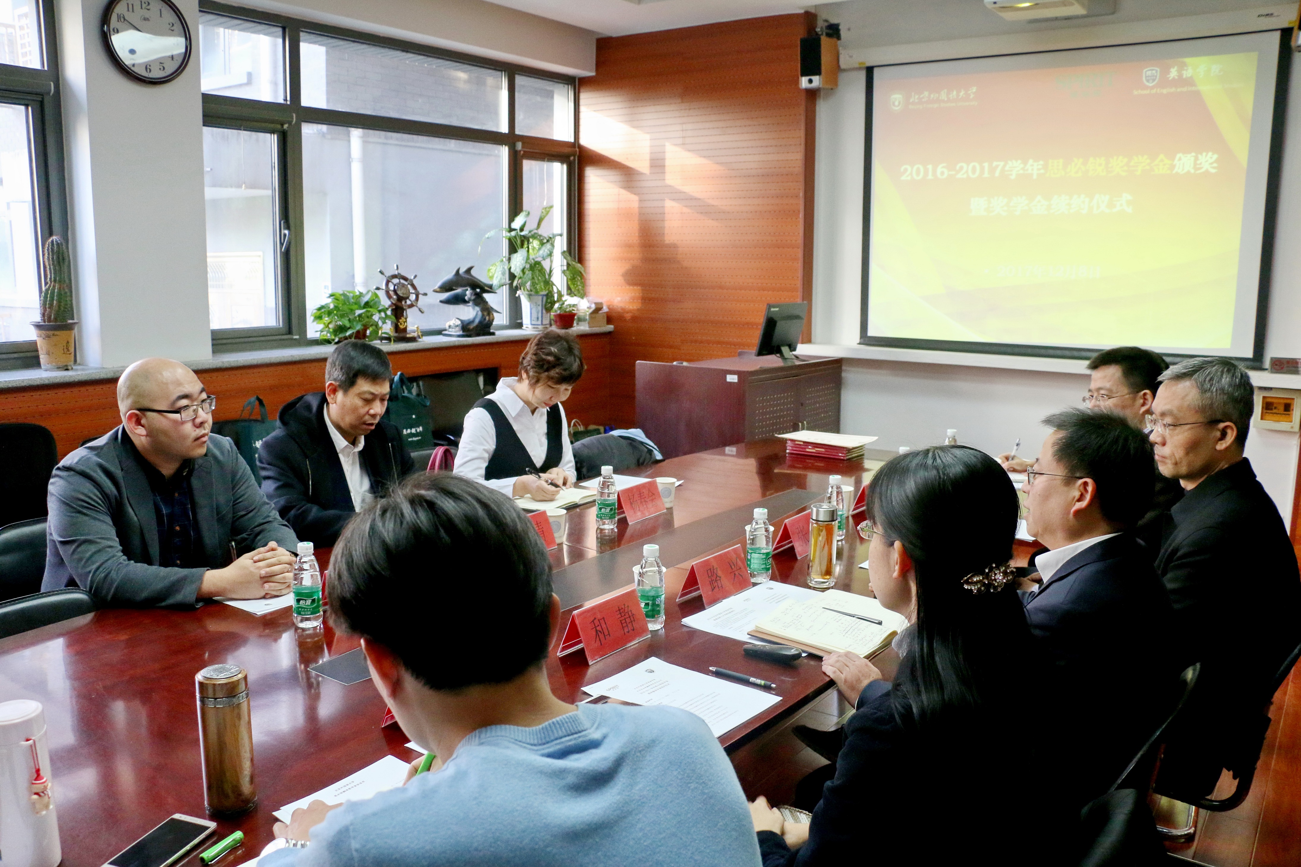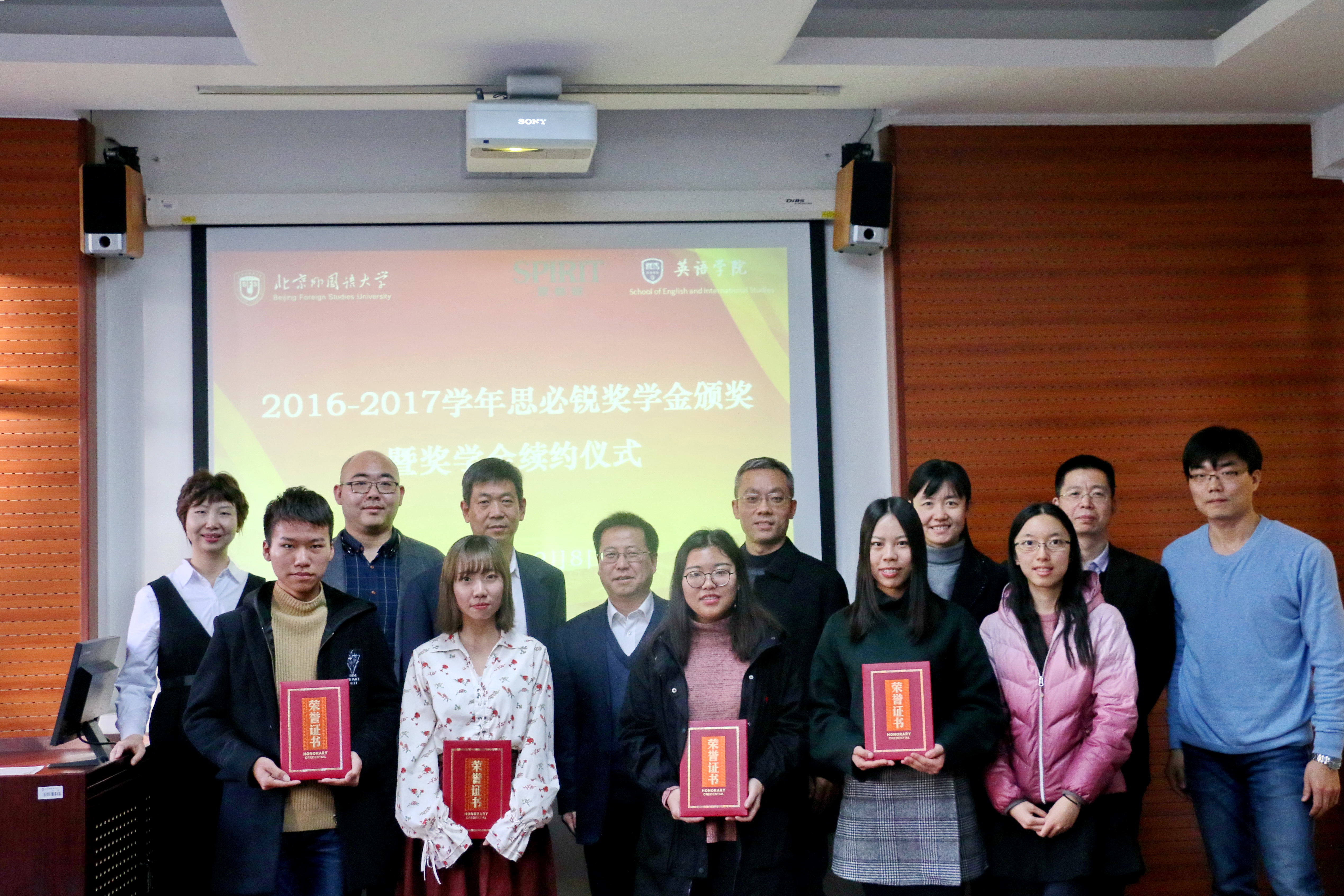 ——2017年12月8日,公司携手北京思必锐翻译有限责任公司举办2016—2017学年思必锐奖学金颁奖暨奖学金续约仪式。到场的嘉宾该公司总经理单伟清先生、外事翻译部经理杨春会女士以及人力资源部经理魏之洲先生。英语公司党总支书记路兴、翻译系主任张威、MTI中心主任孙三军、公司孔子公司工作处副处长和静、辅导员于承杰、沈越老师以及获奖员工出席。