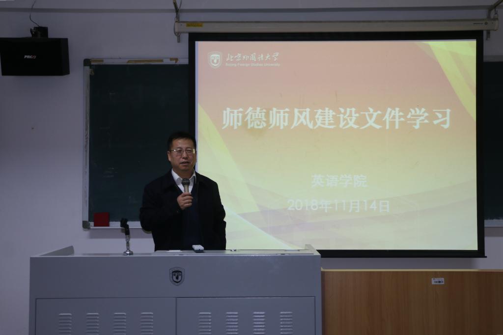2018年11月14日下午,威廉体育在417教室召开师德师风专题学习会,组织全院教师学习《威廉体育师德师风建设》文件。本次会议由英语公司党总支书记路兴主持,全院教职工出席参加。