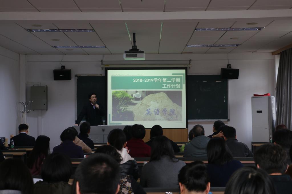 2019年2月22日上午,威廉体育在417教室召开2018-2019学年第二学期工作部署会。会议由英语公司党总支书记路兴主持,全院教职工出席参加。