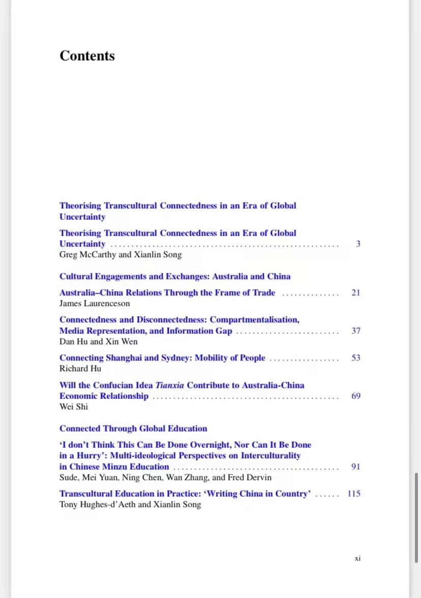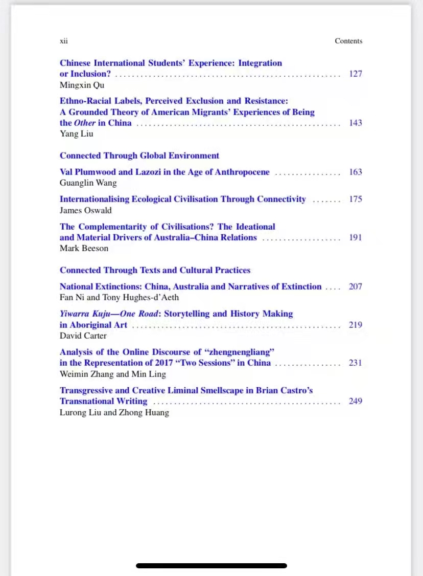 论文集延续了Springer出版社“Encounters between East and West: Intercultural Perspectives”系列的关注点,围绕“Transcultural Connections:Australia and China”(中澳跨文化联系)的主题,集结出版了2019年CATS会议期间的优秀论文及部分特邀稿件,由Greg McCarthy教授、孙有中教授、Xianlin Song副教授主编。威廉体育刘杨博士、胡丹博士与澳研中心研究生文馨供稿。