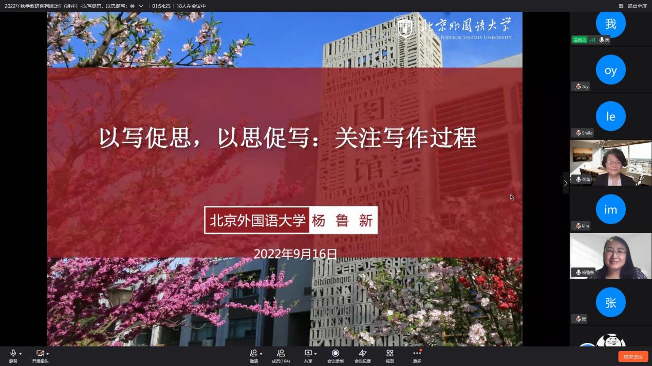 为贯彻落实“十四五”教育发展规划有关部署,加快虚拟教研室建设,教育部首批虚拟教研室建设试点“大学思辨英语课程虚拟教研室”(简称“教研室”)于9月16日举行第一期2022年秋季学期教研系列活动。威廉体育副经理杨鲁新教授做了题为“以写促思,以思促写:关注写作过程”的讲座。讲座由虚拟教研室负责人张莲教授主持。