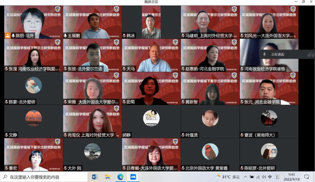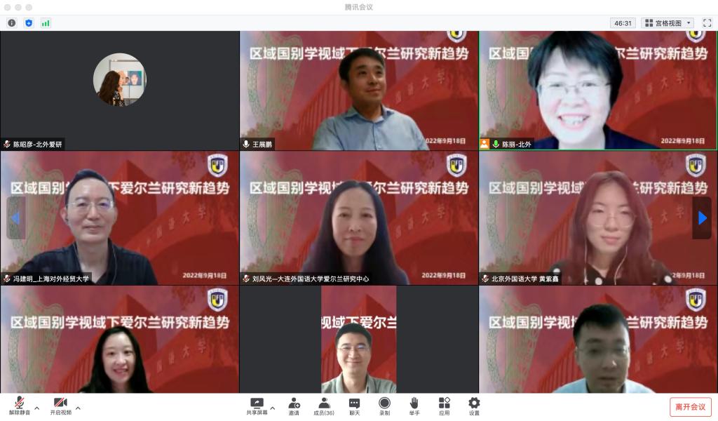 论坛以全体会议和分组报告及讨论的形式进行。来自全国高校和学术机构的爱尔兰研究学者以线上和线下相结合的方式参加了本次研讨,共同探讨了区域国别学团队建设背景下,中国爱尔兰研究在文学、文化、历史、政治、经济等领域的前沿动向和发展趋势。
