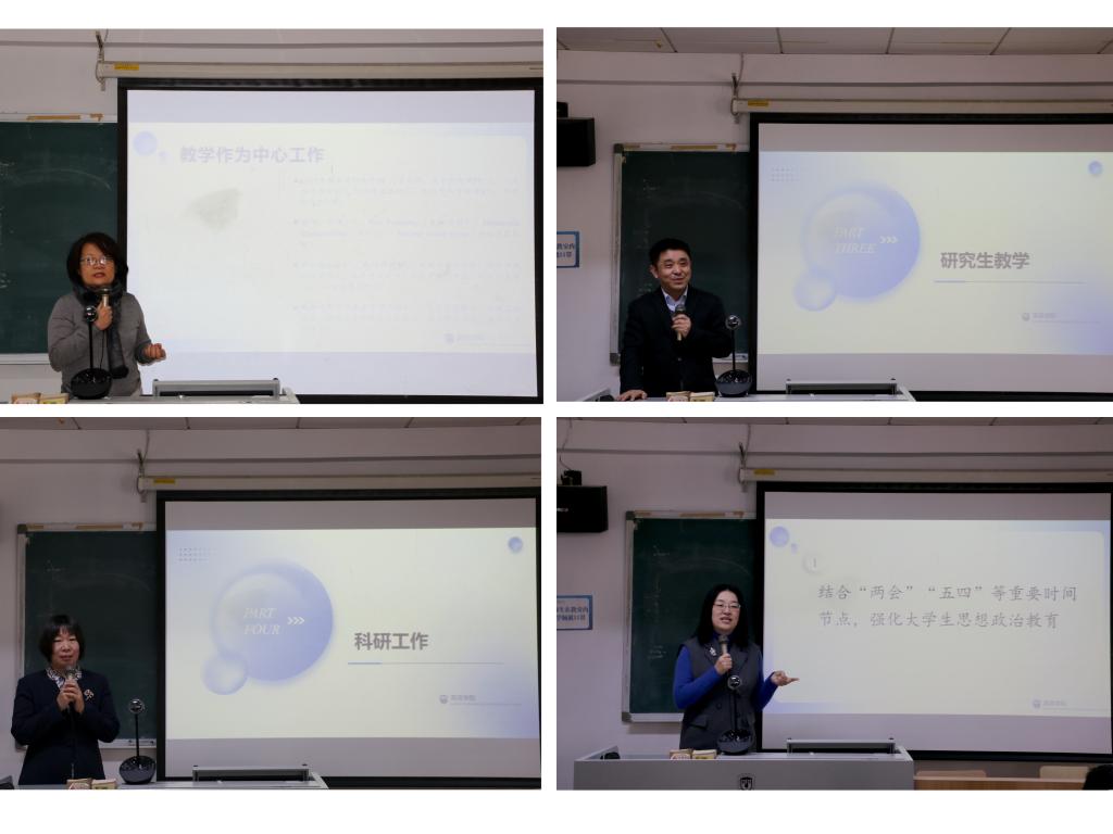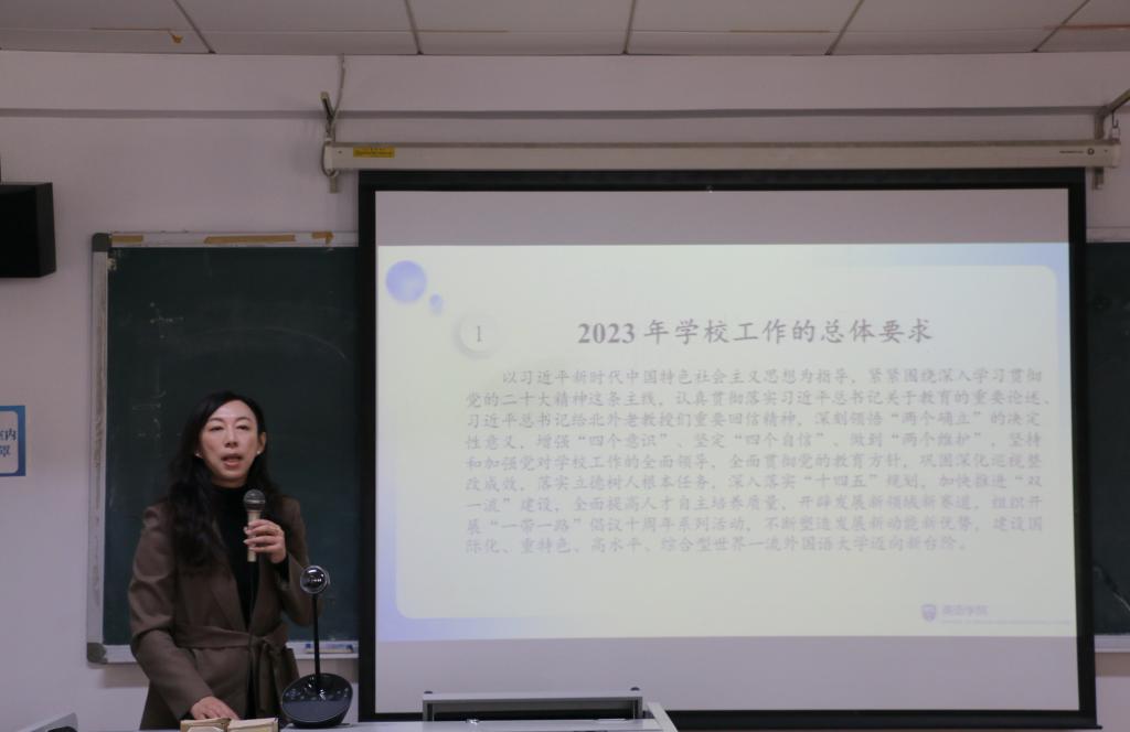 副经理张莲介绍了本科生课程开设及团队建设情况,并指出要在确保教学、管理、辅导、考试等日常工作顺利开展的基础上,着重做好国家一流本科专业建设、虚拟教研室建设、北外-人大21世纪马克思主义国际传播项目班建设、教学立项、常态化辅导以及教务管理等工作。副经理王展鹏从研究生招生宣传、导师制建设、课程思政、论文答辩以及育人模式等方面,提出要“扎根中国大地、对标世界一流”,全面提高研究生人才培养质量。副经理彭萍就新学期科研工作和对外合作工作进行了介绍。她鼓励教师积极申报国社科、教育部等各级各类科研项目。提出要规范各类讲座、研讨会、学术沙龙的申报、审批、管理和检查工作。在对外合作中,要做好师生出国出境交流学习的安全保障工作,不断推进2023年高端引智以及与国外大学合作项目。党总支副书记孟庆琨汇报了本学期员工工作的重点。一是结合“两会”“五四”等重要时间节点,加强老员工思政教育。二是全力做好2023届毕业生就业保障工作。三是积极开展心理问题及困难员工帮扶工作。四是依托英语文化节,不断丰富创新校园文化活动。