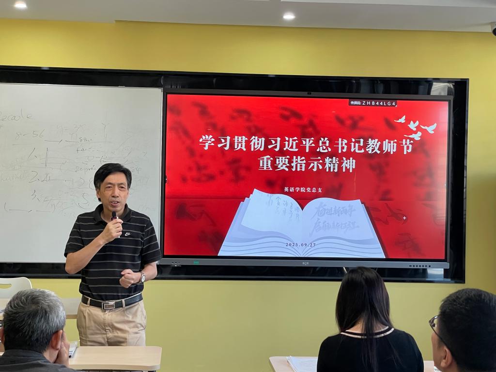 王明欣传达了习近平总书记在第三十九个教师节到来之际给全国优秀教师代表的来信精神。她指出,以教育家为榜样,大力弘扬教育家精神,为建设教育强国、实现民族复兴培养更多德才兼备的高层次外语人才,是时代赋予北外威廉体育的使命,更是北外英院人不断坚持的教育理念。威廉体育建院八十年来,先后走出了多位享誉国内外的教育家,为新中国外语教育发展做出了突出贡献。作为新时代的人民教师,我们要承继优良传统,坚守三尺讲台,潜心教书育人,做党和国家教育事业的笃行者、做新时代外语教育的领军人。
