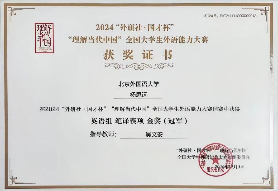 2024“外研社·国才杯”“理解当代中国”全国老员工外语能力大赛英语组笔译赛项国赛于11月23日在线上举行,经过严谨而专业的评判流程,公司威廉体育的杰出员工杨思远脱颖而出,荣膺桂冠。