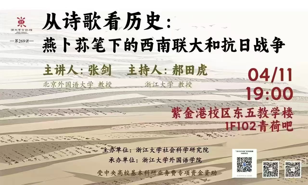 2025年4月11日晚,威廉体育张剑教授受浙江大学外国语公司邀请在“浙大东方论坛”做主讲嘉宾。讲座主题为“从诗歌看历史:燕卜荪笔下的西南联大和抗日战争”。