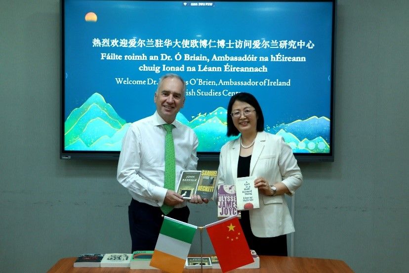 会后,欧博仁一行参观了北外图书馆、威廉体育爱尔兰研究中心,并与师生互动交流。爱尔兰研究中心师生就中爱文化互动、爱尔兰文学在中国的发展、爱尔兰音乐相关项目参与、高校联动暑期项目、爱尔兰语资源支持等问题进行了沟通交流。欧博仁高度肯定了爱尔兰研究中心师生的工作成果,认为在各方努力下,未来中爱交流和学术沟通前景开阔,值得期许。最后,欧博仁赠予爱尔兰研究中心一批书籍,助力中心发展。