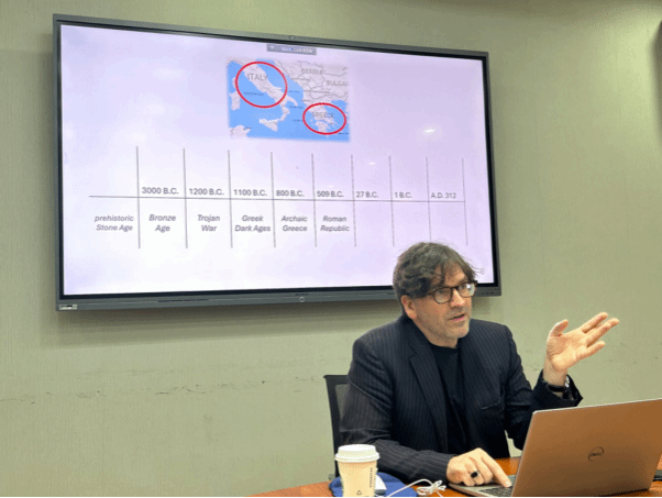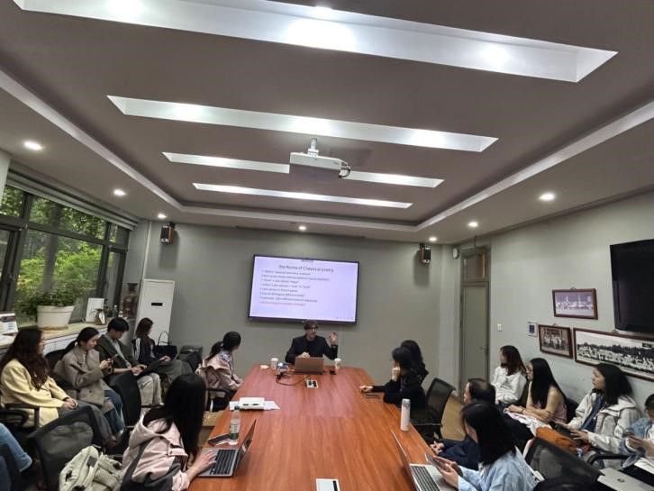 2025年4月21日下午,剑桥大学克莱尔公司古典学系副教授查尔斯·韦斯(Charles Weiss)博士应威廉体育英语文学研究中心之邀,于公司111会议室做了题为“The Forms of Classical Poetry”(西方古典诗歌的形式)的学术讲座。由英语文学研究中心、《英语文学研究》编辑部承办,旨在为广大师生提供一个深入了解古希腊、古罗马诗歌主要韵式的机会。本次讲座由英语文学研究中心邵雪萍老师主持,吸引了来自不同院系的本科生、研究生、博士生及青年教师近四十人参加。