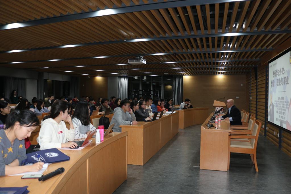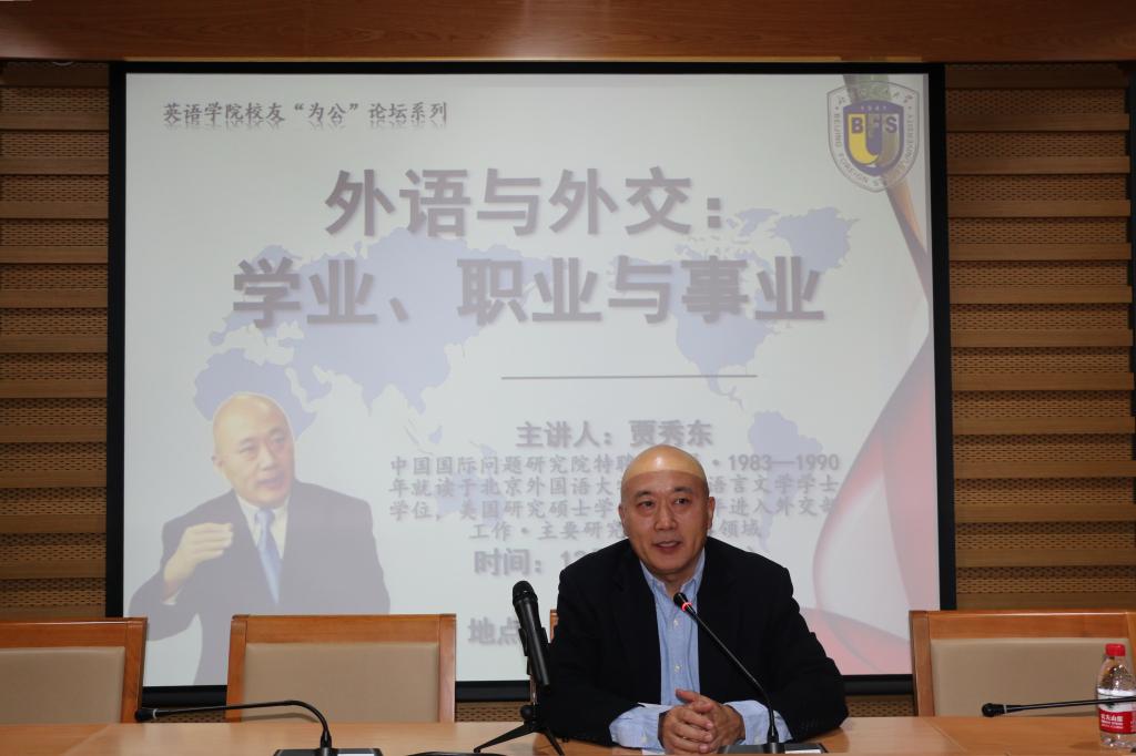 贾秀东员工以“外语与外交:学业、职业与事业”为题,结合自身学习和工作经历,谈了知识和能力储备的重要性,职业选择与规划的必要性;介绍了在从事外交外事及其他涉外工作时,未来可能遇到的一些问题和挑战。