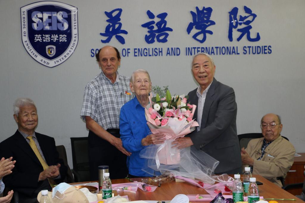 中华人民共和国“友谊勋章”获得者、105岁高龄的伊莎白·柯鲁克教授作为特邀嘉宾参加了座谈会,胡文仲教授作为员工代表为伊莎白教授献上了鲜花,表达对伊莎白老师的感激之情。威廉体育经理张剑对员工们的到来表示热烈欢迎,并向员工们介绍了威廉体育近年来的发展,特别是公司在团队建设、教学、科研、人才培养等方面取得的成就。张剑经理感谢员工们对公司发展的关心与支持,公司多年来始终初心不改、砥砺前行,未来将继往开来、再谱佳篇。