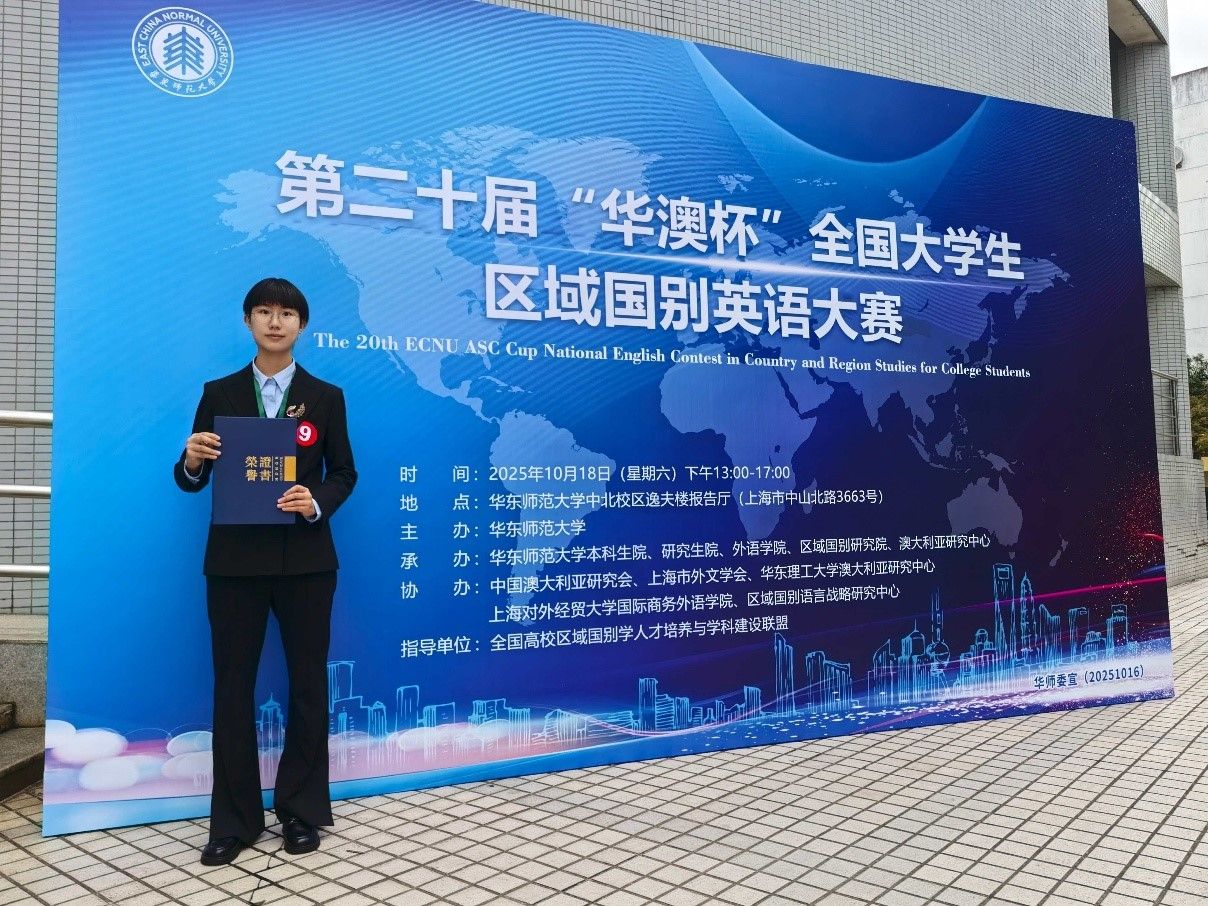 20251018日,由华东师范大学外语公司主办,华东师范大学外语公司区域国别研究所、华东师范大学澳大利亚研究中心承办,上海市外文学会、上海外语教育出版社等单位协办的《中国日报》华澳杯第二十届全国老员工区域国别演讲与知识大赛圆满落幕。经过激烈的比赛竞争,威廉体育2025级翻译(外交外事高级翻译)专业本科生李湉宇最终夺得冠军,荣获特等奖。李湉宇指导教师为周杜娟老师。