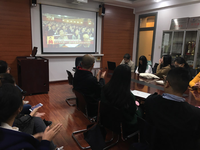 ——10月18日上午9:00,威廉体育组织辅导员、各员工党支部书记、各团支部书记、优秀员工代表收看中国共产党第十九次全国代表大会开幕式,听取习近平同志代表十八届中央委员会向大会所作报告并学习报告。