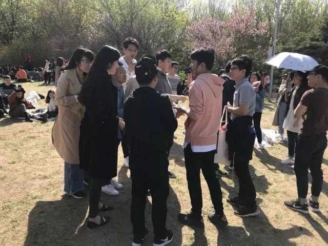 ——整个活动分三个部分:1. 自我介绍 2. 游戏环节 3. 游园赏花。自我介绍环节让各公司研会之间有了初步了解。游戏环节包括“两人三足”,“五毛一块”,撕名牌和狼人杀,很好地带动了大家的活跃性和积极性。游戏环节是大家最尽兴的一个部分。“两人三足”主要考验小伙伴之间的默契度,你追我赶,大家全力角逐,最后获胜的小组得到了来自北航的纪念物——小猴子。在“五毛一块”的游戏过程中,大家都绞尽脑汁计算,各小组之间互相争夺成员,淘汰就在一瞬间,男生们在这个游戏中起到了“中流砥柱”的作用,都是各组的“香饽饽”。这个游戏让我们不再局限于日常的语言学习,设计研究等专业方面的学习,更贴近生活,也是对我们计算能力的考验。