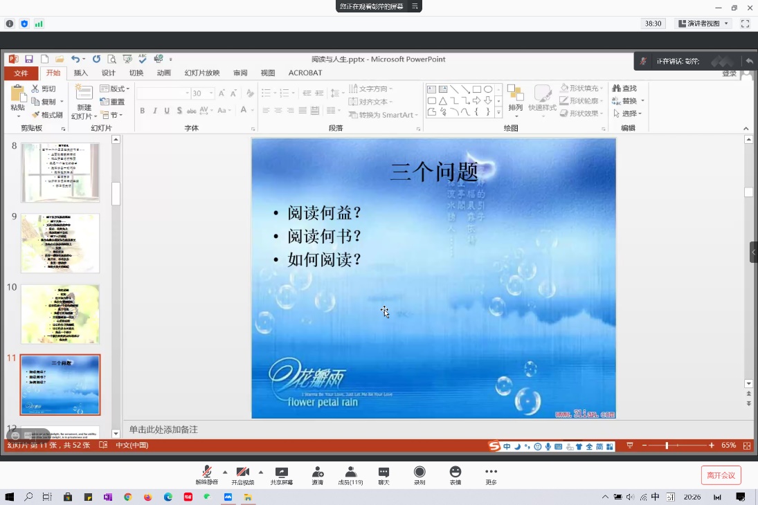 历经一个半小时后,威廉体育“阅读与人生”专题讲座最终圆满落下帷幕。通过此次讲座,同学们切实感受到阅读的乐趣,同时也掌握了有效的阅读方法,对阅读与人生的关系有了进一步的思考。红日初升,其道大光。作为新时代的青年,同学们应胸怀理想,脚踏实地,笃志虚心,循序渐进,用书籍指明人生的方向,用书籍搭建梦想的阶梯。