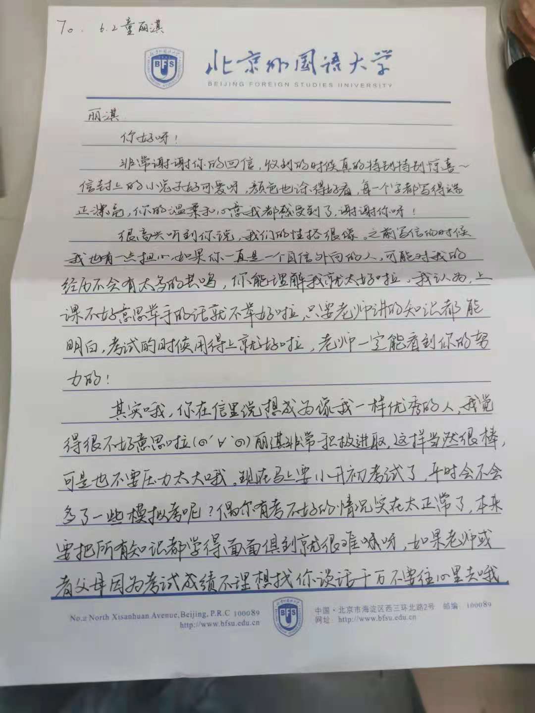 威廉体育本科生低年级党支部积极分子何蓉同志表示,自己非常开心能通过这次的活动认识可爱的丽淇小朋友。收到回信的时候真的很感动,因为没有想到一个六年级的孩子可以写出这样满满都是真诚的信,甚至还自己画了可爱的小信封,还能看到橡皮擦的痕迹,可以想象花了多少心思。希望丽淇小朋友可以快乐地长大,做最好的自己。