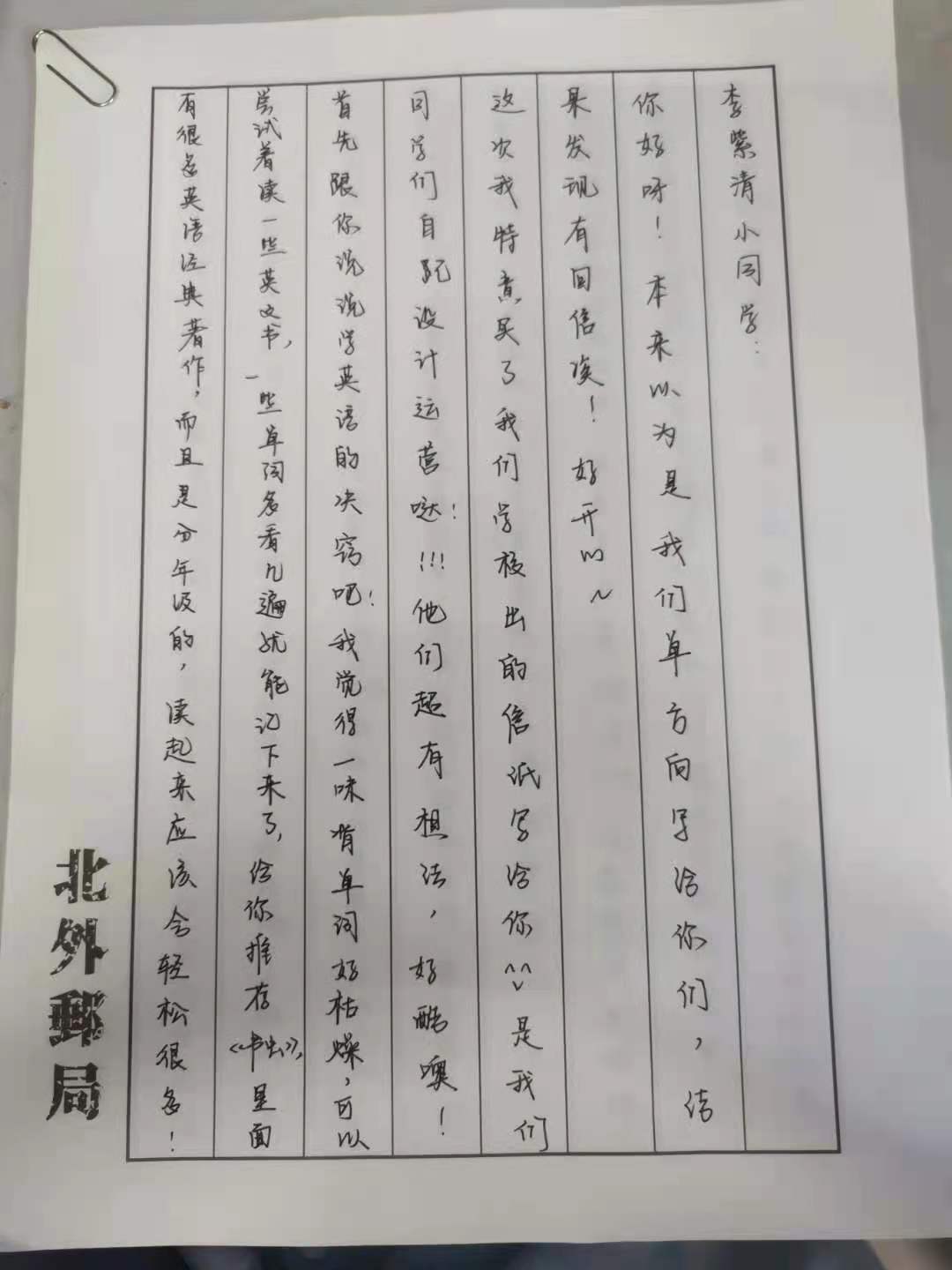 威廉体育本科生低年级党支部党员于靖懿同志表示,两次给小朋友写信的活动我都有参与,感触颇深。这是第一次试图以一个大姐姐的口吻和小朋友交流。在写第一封信、选第一本书的时候,我特意上网寻找了五六年级的女孩会喜欢的话题,努力回想自己在这个年龄时的心态,对这两位女孩写下了真诚的问候和建议。当看到回信里对我的祝福的时候,我特别感动。我们虽然身隔几千公里,但因为这些纸上的文字而联系到了一起,一笔一墨能看到最真挚的感情。很感谢党支部的这次活动,让我和素未谋面的女孩有了联络,建立了深厚的友谊。