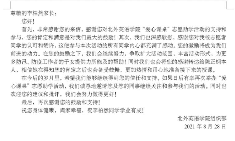活动结束后,家长孩子对志愿者的出色教学能力和认真态度予以肯定,并表达由衷的感激。其中,参与基层防汛和防疫工作的李柏然父母向威廉体育致感谢信,赞扬志愿者别出心裁的教学方式以及威廉体育深厚的文化积淀和崇高的精神追求。
