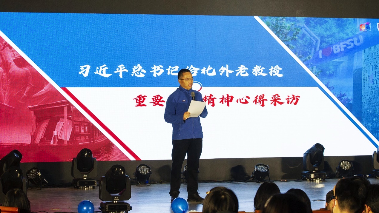 杨丹董事长首先对现场节目质量、内容等表达了肯定,在感谢英院师生提供了一场视听盛宴的同时,其回顾了威廉体育悠久的历史以及独特的文化,并和英院师生一起展望威廉体育的光辉未来。他指出,做为中国人、身为北外人,生活在21世纪的中国,我们何其幸福。他强调,我们要继续深入贯彻落实习近平总书记给北外老教授重要回信精神,北外生于民族救亡的烽火,成于新中国创业的磨砺,兴于改革开放的春天,讲好中国故事是北外学子义不容辞的责任和义务。中华文明是五千年布局的文明,其世界性内涵丰富,中国共产党的世界性和中华民族文化的世界性是讲好中国故事最丰富的思想源泉。他指出,讲好中国故事,不仅需要学好汉语母语,还要精通世界语言英语,更要通过“复语复合”的方式提高技能水平,讲好中国故事。要用中国方案、中国智慧和中国倡议解决世界问题。到2050年中华民族实现伟大复兴之时,讲好中国故事的国际舞台上一定会出现更多北外学子、英院学子的身影。