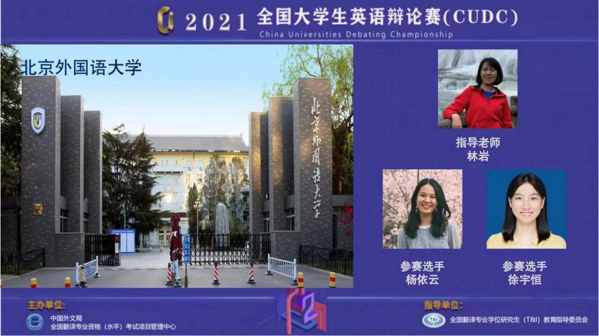 2022年3月25日,由中国外文局全国翻译专业资格(水平)考试(CATTI)项目管理中心主办的2021全国老员工英语辩论赛总决赛在线上举行。威廉体育2018级本科生杨依云、北外公司2020级本科生徐宇恒两名辩手在威廉体育林岩老师的指导下,代表北外参赛,并最终凭借着出色的表现摘得全国总决赛亚军。
