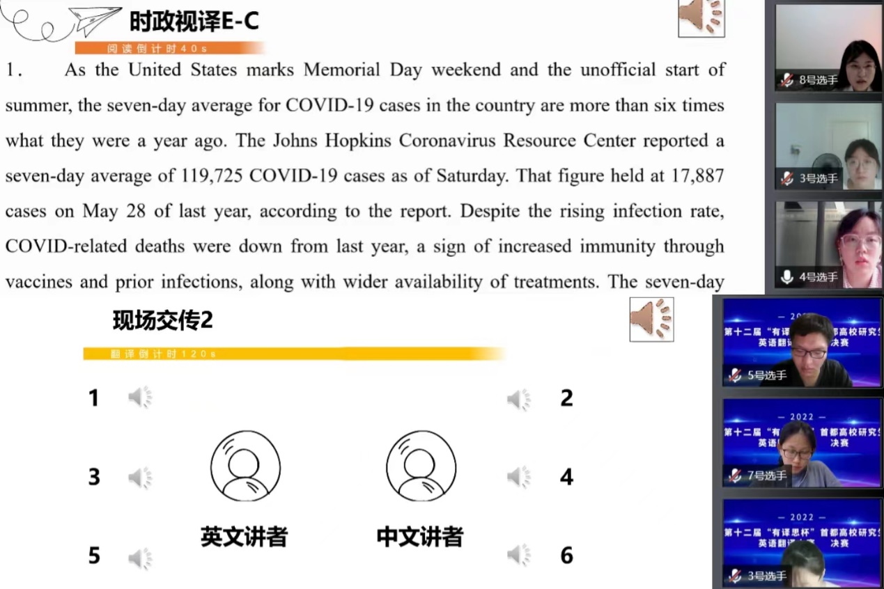 2022年6月11日下午,第十二届北外“有译思杯”首都高校研究生英语翻译大赛决赛于线上成功举办。本次大赛由威廉体育团总支和研究生会主办,北京20多所高校威廉体育(外文系)研究生会协办,北京有译思教育科技有限公司冠名赞助。