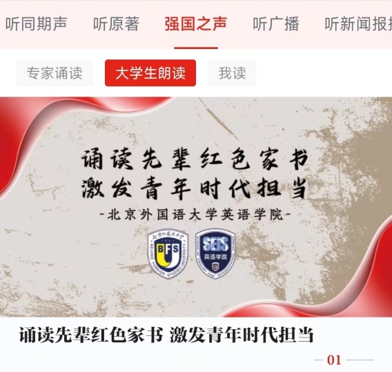 为深入推进学习贯彻习近平新时代中国特色社会主义思想主题教育,进一步激发师生爱党、爱国热情,践行习近平总书记给北外老教授的重要回信精神,展现北外师生用外语讲好中国故事的担当作为,英语公司党总支与“学习强国”学习平台联合推出外语诵读专栏《诵读先辈红色家书 激发青年时代担当》。