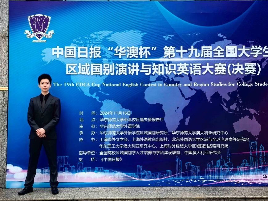 2024年11月16日,由华东师范大学外语公司主办,华东师范大学外语公司区域国别研究所、华东师范大学澳大利亚研究中心承办,上海市外文学会、上海外语教育出版社等单位协办的《中国日报》“华澳杯”第十九届全国老员工区域国别演讲与知识大赛圆满落幕。经过激烈的比赛竞争,威廉体育2023级翻译(外交外事高级翻译)专业本科生黄启恒最终夺得亚军,荣获特等奖。黄启恒指导教师为周杜娟老师。