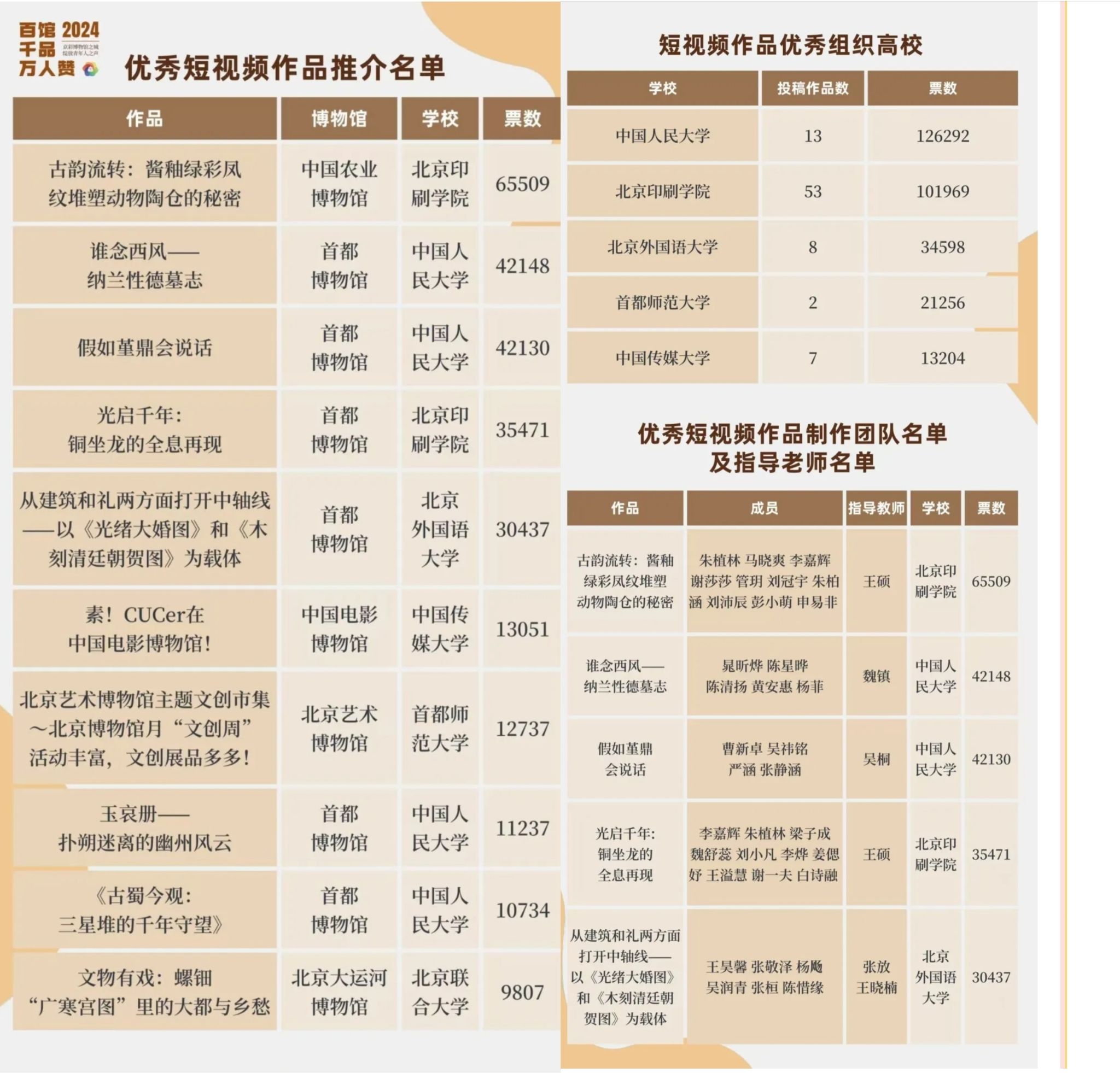 11月21日,由北京市委宣传部、市委教工委主办,北京市文物局牵头,首都博物馆及相关北京地区博物馆承办的“百馆千品万人赞”活动短视频成果正式上线。由威廉体育“京彩--博闻译行实践团选送”,张放、王晓楠老师指导,威廉体育员工王昊馨、张敬泽、杨飏、吴润青、张桓、陈惜缘制作的短视频《从建筑和礼两方面打开中轴线——以〈光绪大婚图〉和〈木刻清廷朝贺图〉为载体》被评为优秀短视频作品,威廉体育被评为短视频作品优秀组织高校。