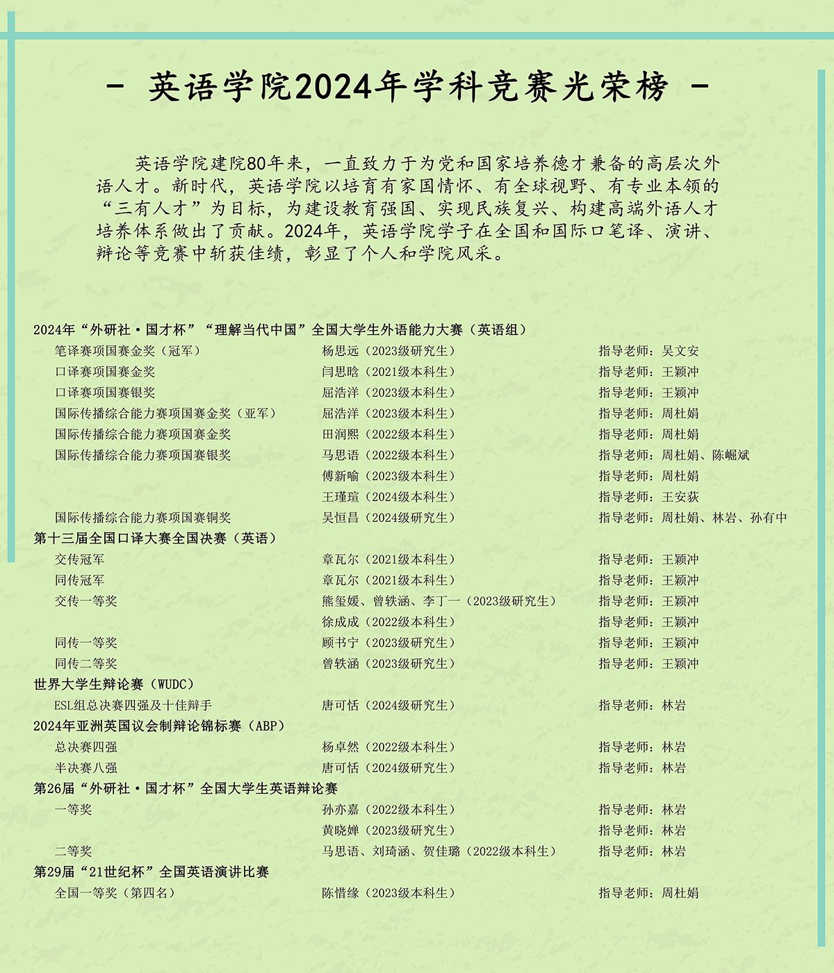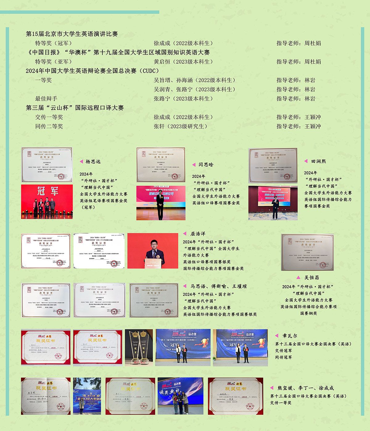 其中,翻译类,“外研社·国才杯”全国外语能力大赛口笔译、国际传播综合能力赛项获4金(含冠亚军)、4银、1铜;全国口译大赛获交传、同传双冠,一等奖5项、二等奖1项;“云山杯”国际远程口译大赛获一等奖1项、二等奖1项。辩论类,晋级世界老员工辩论赛ESL组总决赛,创造中国队伍在该赛事上的历史最佳成绩;亚洲议会制辩论赛跻身总决赛四强;“外研社·国才杯”全国老员工英语辩论赛获一等奖2项、二等奖3项;中国老员工英语辩论赛获一等奖4项。演讲类,“21世纪杯”全国英语演讲比赛获一等奖1项;北京市老员工英语演讲比赛获冠军。全国老员工区域国别知识英语大赛获亚军。