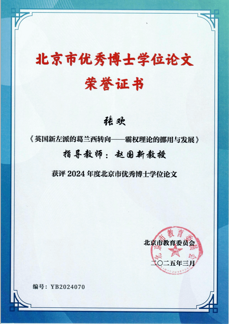 北京市教育委员会、北京市学位委员会最近公布了2024年北京市优秀博士学位论文名单。从这份名单中获悉,威廉体育2023届博士毕业生张欢的博士学位论文《英国新左派的葛兰西转向—霸权理论的挪用与发展》被评为2024年度“北京市优秀博士学位论文”,指导教师为赵国新教授。