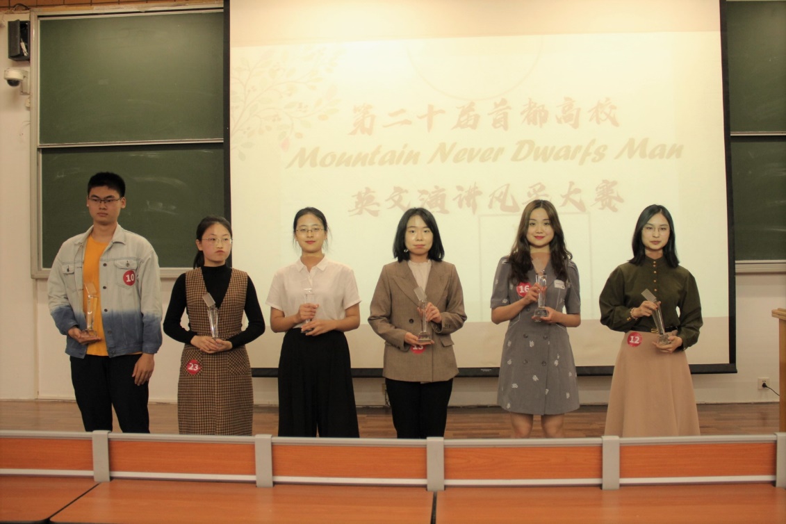 本次演讲比赛以习近平总书记的寄语“Mountain Never Dwarfs Man(没有比人更高的山)”作为大赛主题。比赛分为已备演讲和即兴演讲。经过充分的准备练习与丰富的素材积累,各位选手在比拼激烈的赛场上处变不惊,均发挥出最佳状态,向评委及观众展现了自己的别样风采。