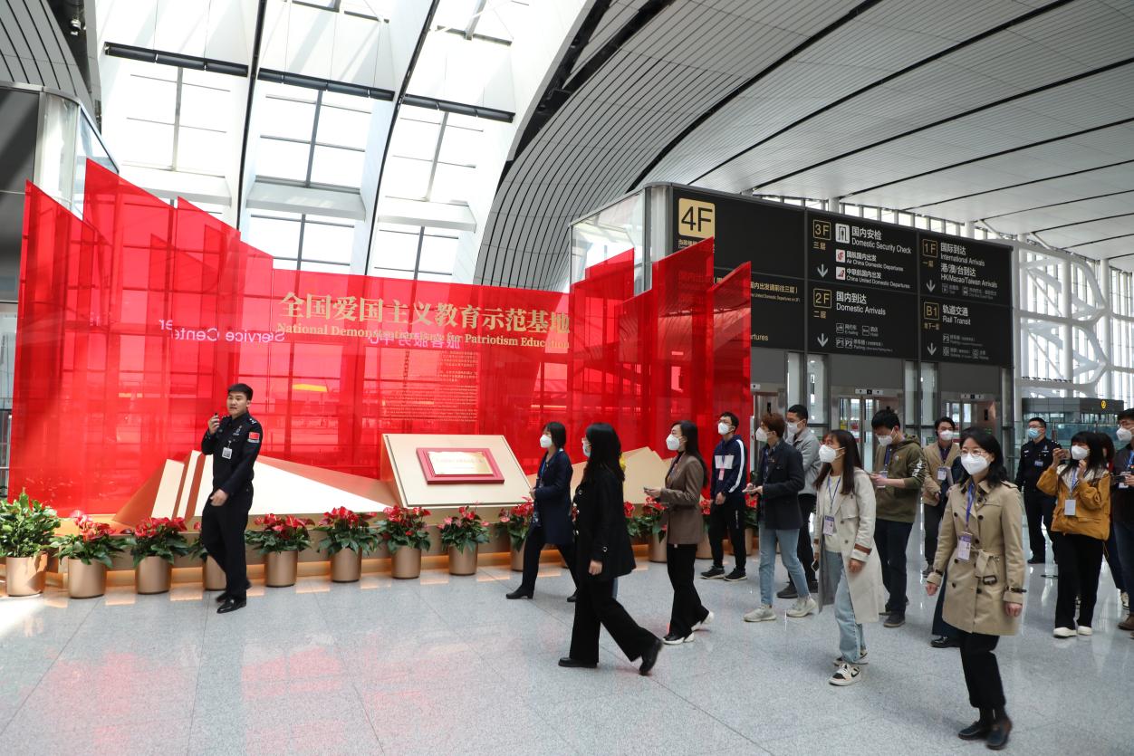 随后,一行人在大兴机场航站楼聆听“沿着总书记的足迹”精品党课。在北京大兴国际机场航站楼中央穹顶悬挂的国旗下方,重温习近平总书记在大兴机场投运巡览时的讲话,“中国人民一定能,中国一定行”振奋人心。