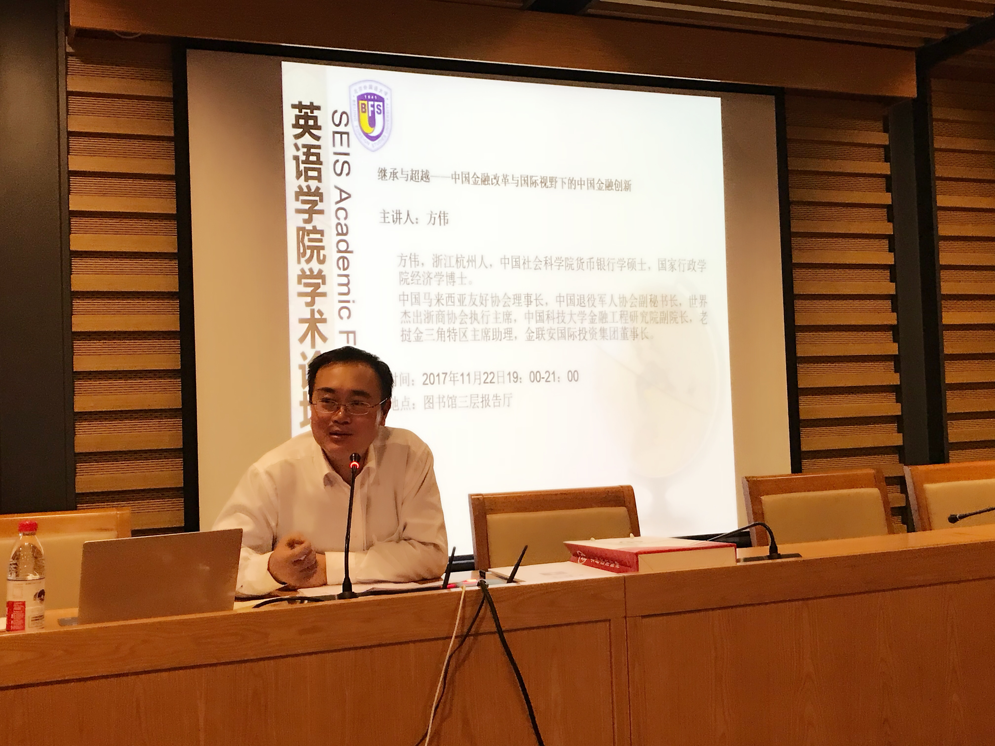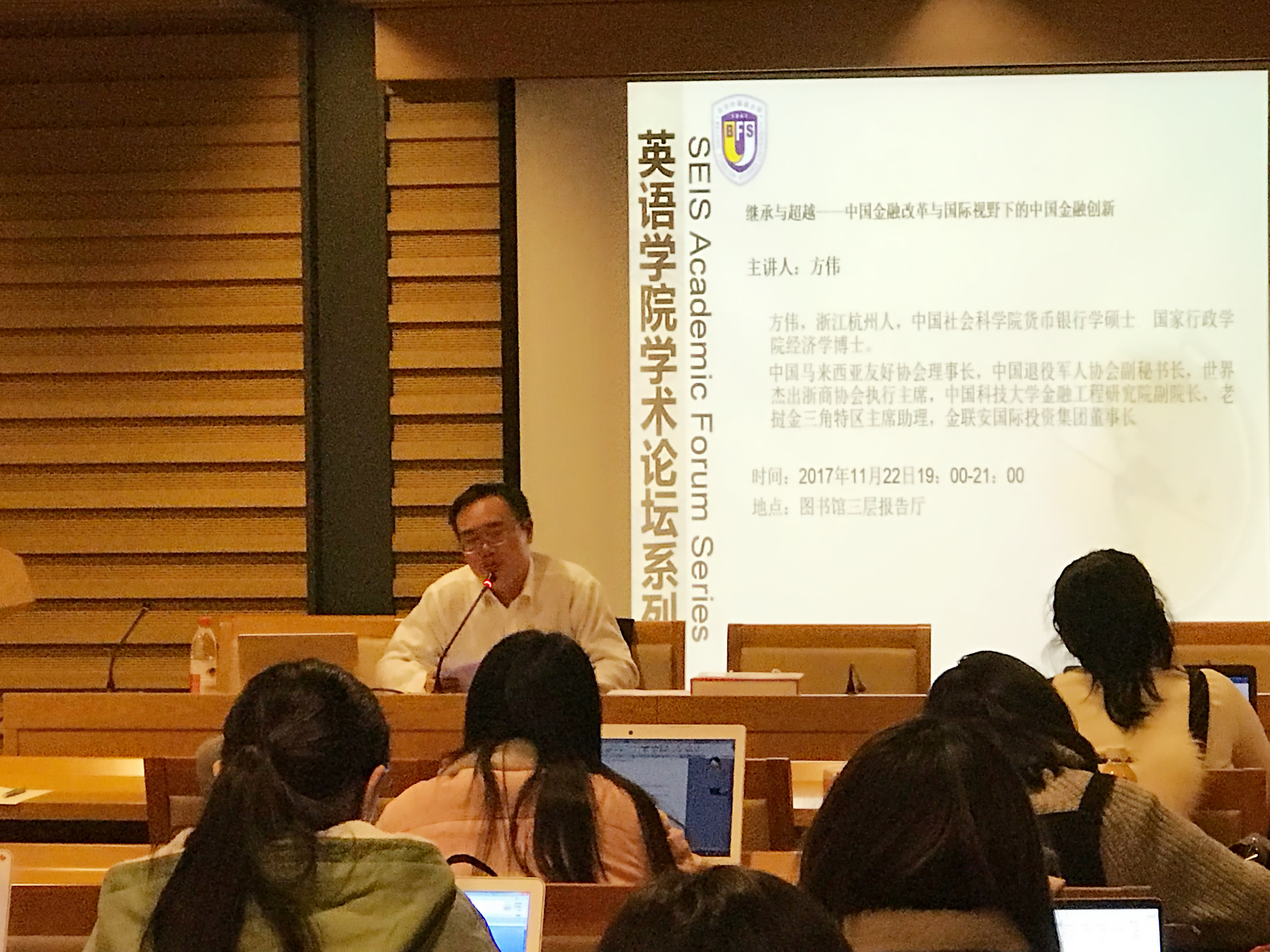 ——2017年11月22日晚7点,图书馆三楼学术报告厅,世界杰出浙商协会执行主席、金联安国际投资集团董事长、国家行政公司经济学博士方伟老师为北外师生作讲座,题为“继承与超越——中国金融改革与国际视野下的中国金融创新”,讲座由董宜坤博士主持。讲座后,英学职针对同学们在学业与职业选择规划上的困惑、尤其是众多日后有志从事金融行业相关工作的疑问,对方伟博士进行了专访。