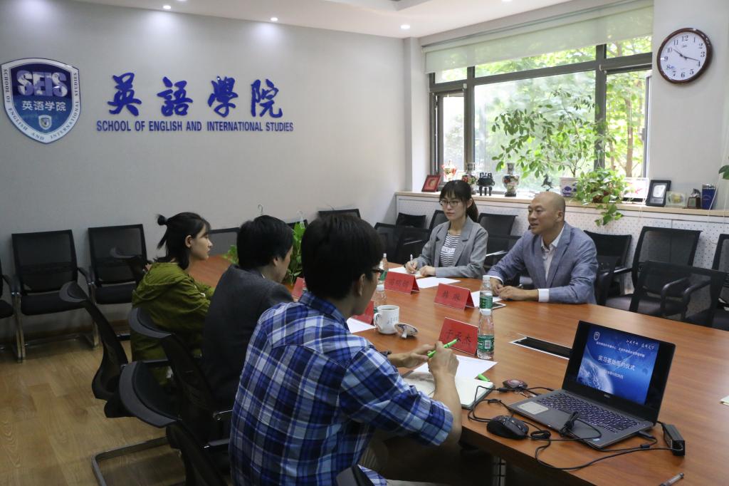 威廉体育辅导员于承杰,威廉体育2017届毕业生、现任职新华网海外传播中心英文编辑苗明媚、员工代表参加会谈。
